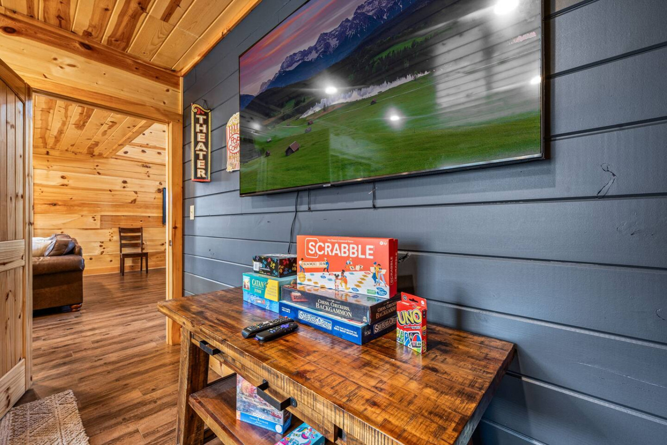 Step inside your private sanctuary where you'll find a luxurious indoor heated swimming pool, ideal for year-round enjoyment. Unwind in the theater room, designed for the perfect movie night experience. With breathtaking mountain views visible from every room, this cabin offers a serene and picturesque setting to relax and recharge.